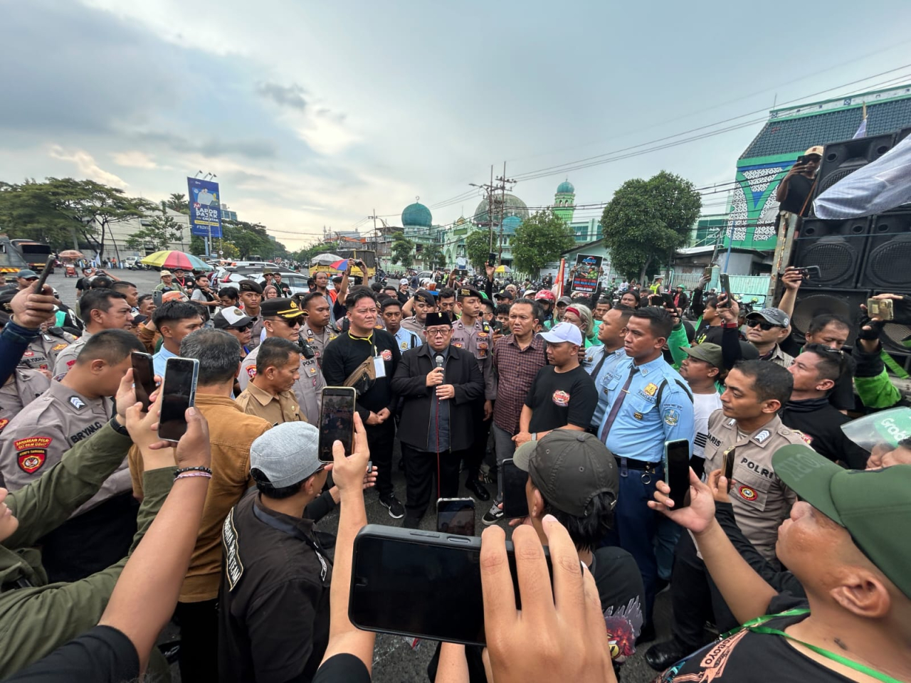 “Berapa kali kami aksi, BBM naik terus. Tapi tarif? Hancur,” seru salah satu orator, disambut sorakan massa.